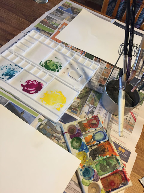 We made sure the kitchen table was covered with plenty of newspaper, and I fished out a pad of watercolour paper, a selection of paint brushes (most of which I also use for my silk painting), a couple of plastic palettes, and a jar of clean water - and we were ready to get going!